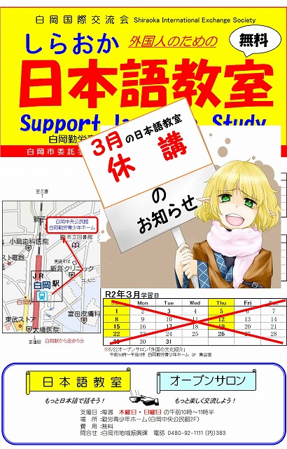 <緊急連絡>2020年3月日本語教室休講